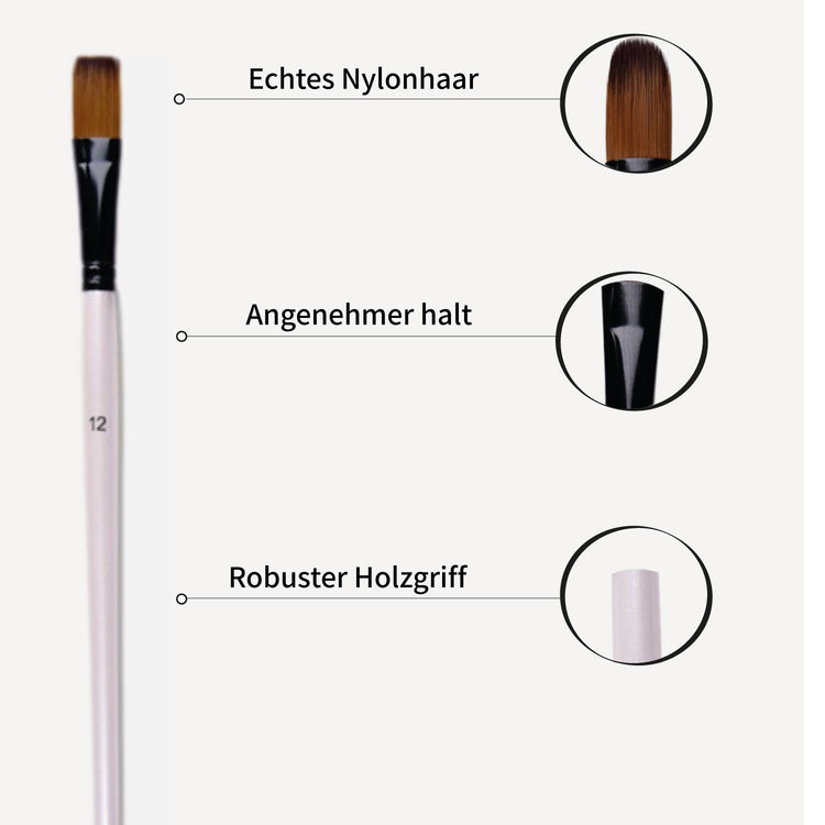 Flache Borsten für eine gleichmäßige Farbverteilung - Die flachen Borsten sind perfekt für Aquarell-, Öl- und Acrylmalerei geeignet. Sie sorgen für eine gleichmäßige Farbverteilung auf Deinem Malgrund und ermöglichen Dir präzises Arbeiten, damit Deine Kunstwerke genau so aussehen, wie Du es möchtest.