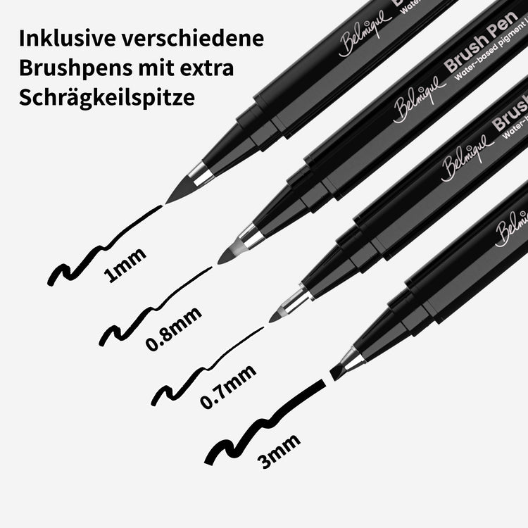 Die drei im Set enthaltenen schwarzen Pinselstifte verleihen Ihren Schriftzügen mehr Tiefe und Dimension. Denn je nachdem, wie viel Druck du auf die Spitze ausübst, variiert auch die Dicke der Striche. Die Spitzen der Pinselstifte sind 0.7 mm, 0.8 mm und 1.0 mm dick. Der schwarze Kalligrafiestift verfügt über die typische flache, abgeschrägte Spitze, die perfekt ist, um damit den bekannten kalligrafischen Stil zu erzeugen.