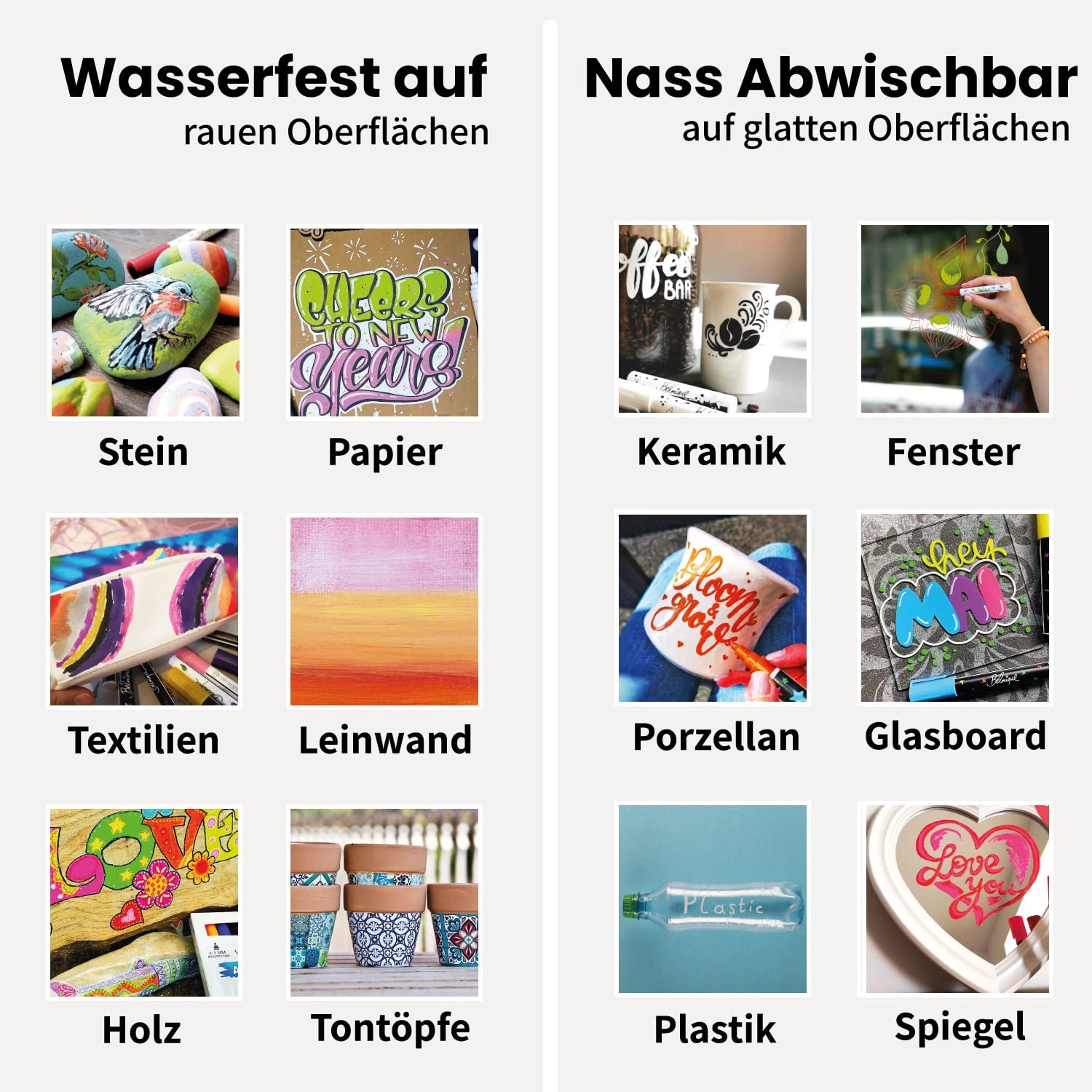 VIELSEITIGE ANWENDUNG: Verwende sie auf rauen Oberflächen wie Stein, Stoff, Holz, Leinwänden oder Ton, um dauerhafte Ergebnisse zu erzielen. Auf glatten Flächen wie Glas sind die Farben leicht abwischbar.